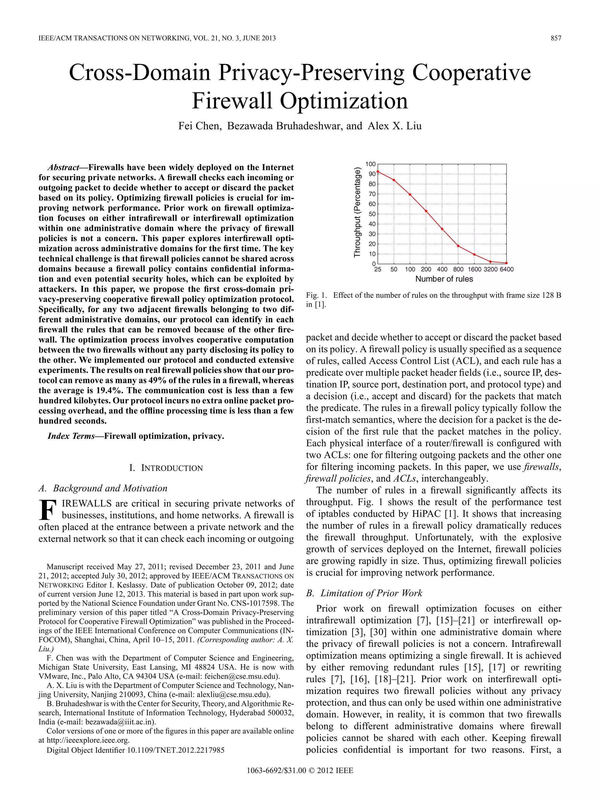 - Prior work on firewall optimization focused only on intra-domain optimization where firewall policies could be shared. This presents the first approach for inter-domain optimization without disclosing private firewall policies.