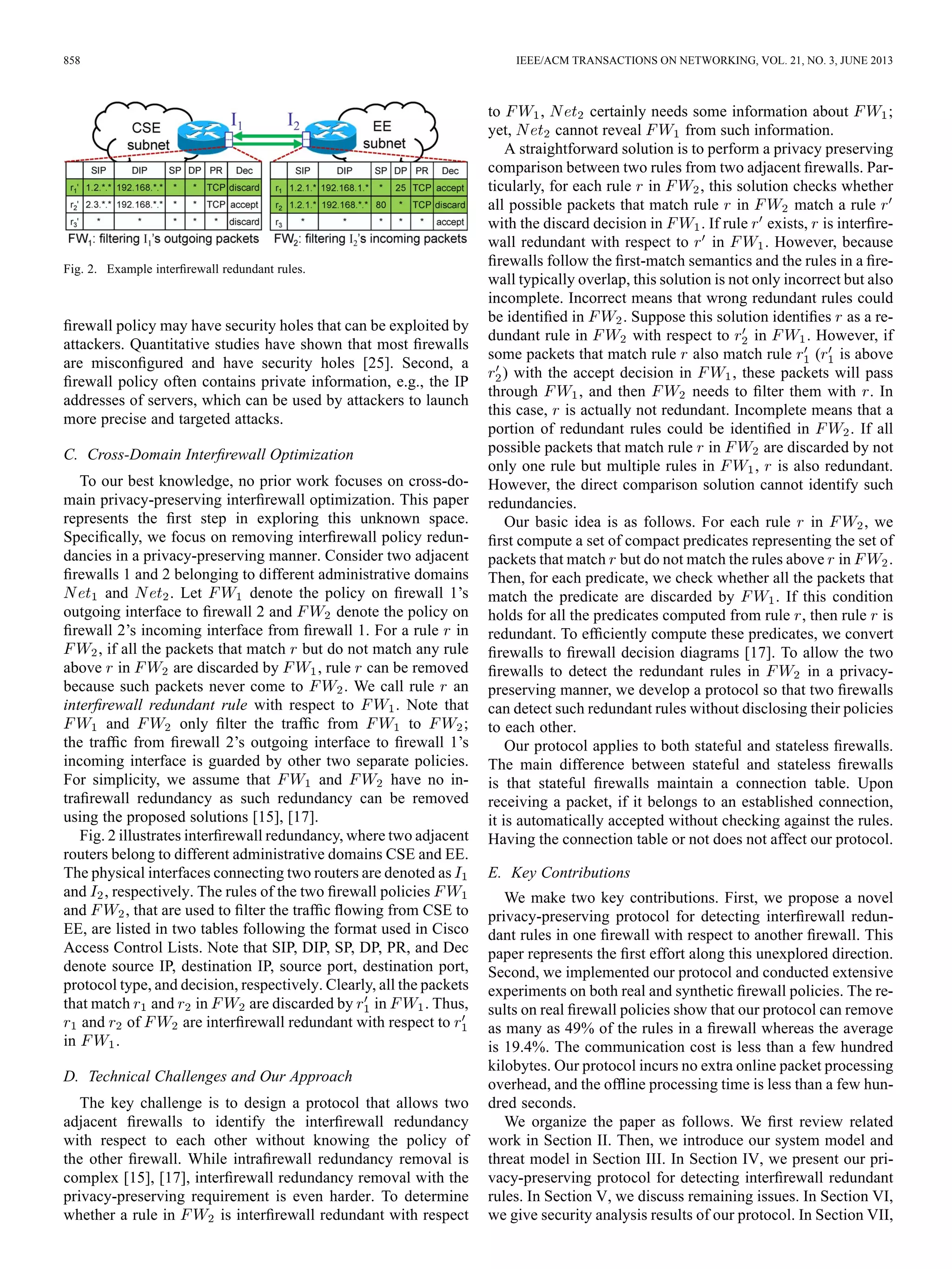 - The key challenge is for two adjacent firewalls from different domains to identify redundant rules in each other's policies without revealing their actual policies. The proposed protocol uses compact predicates and firewall decision diagrams to detect redundant rules through cooperative computation while preserving privacy.