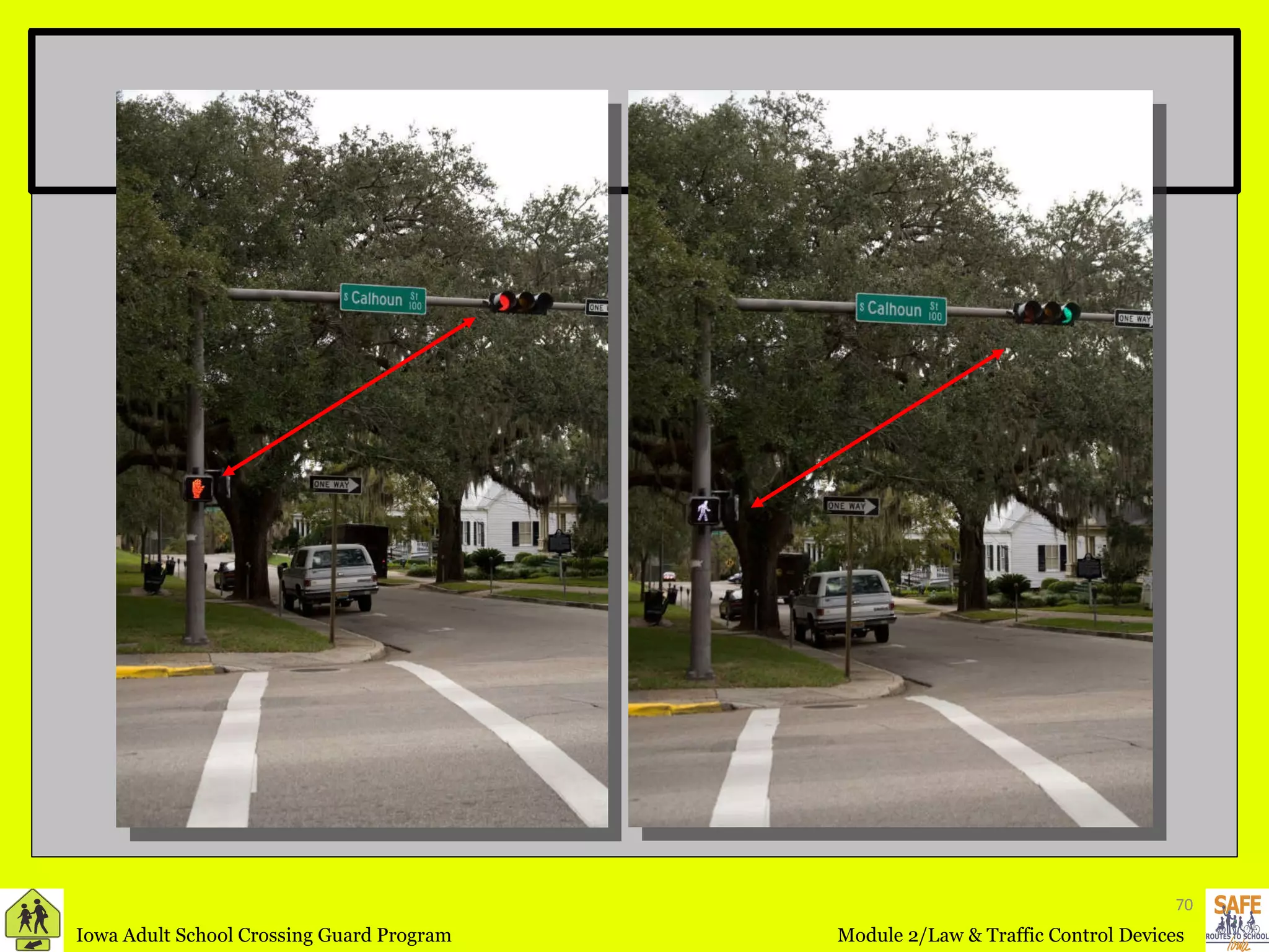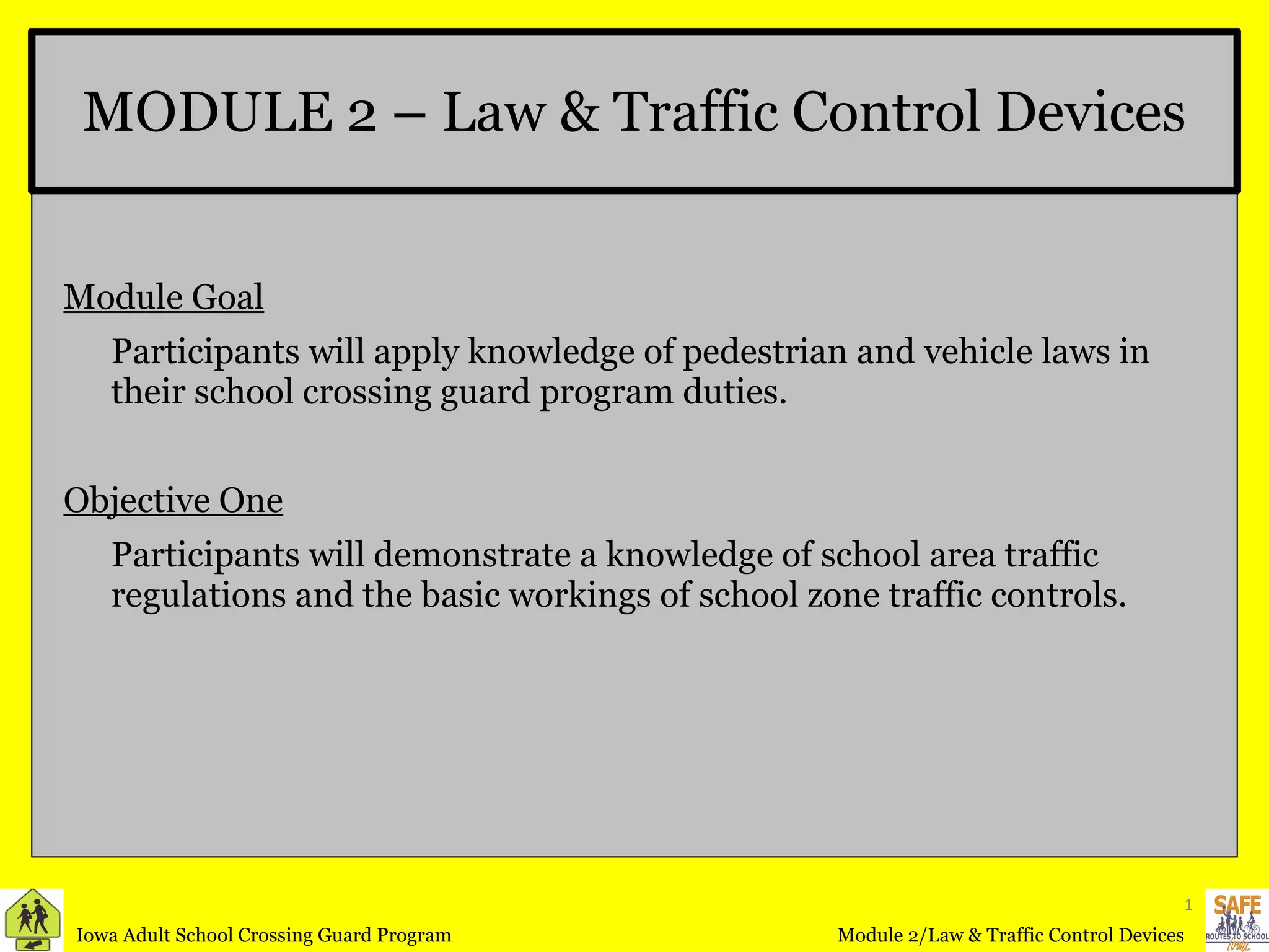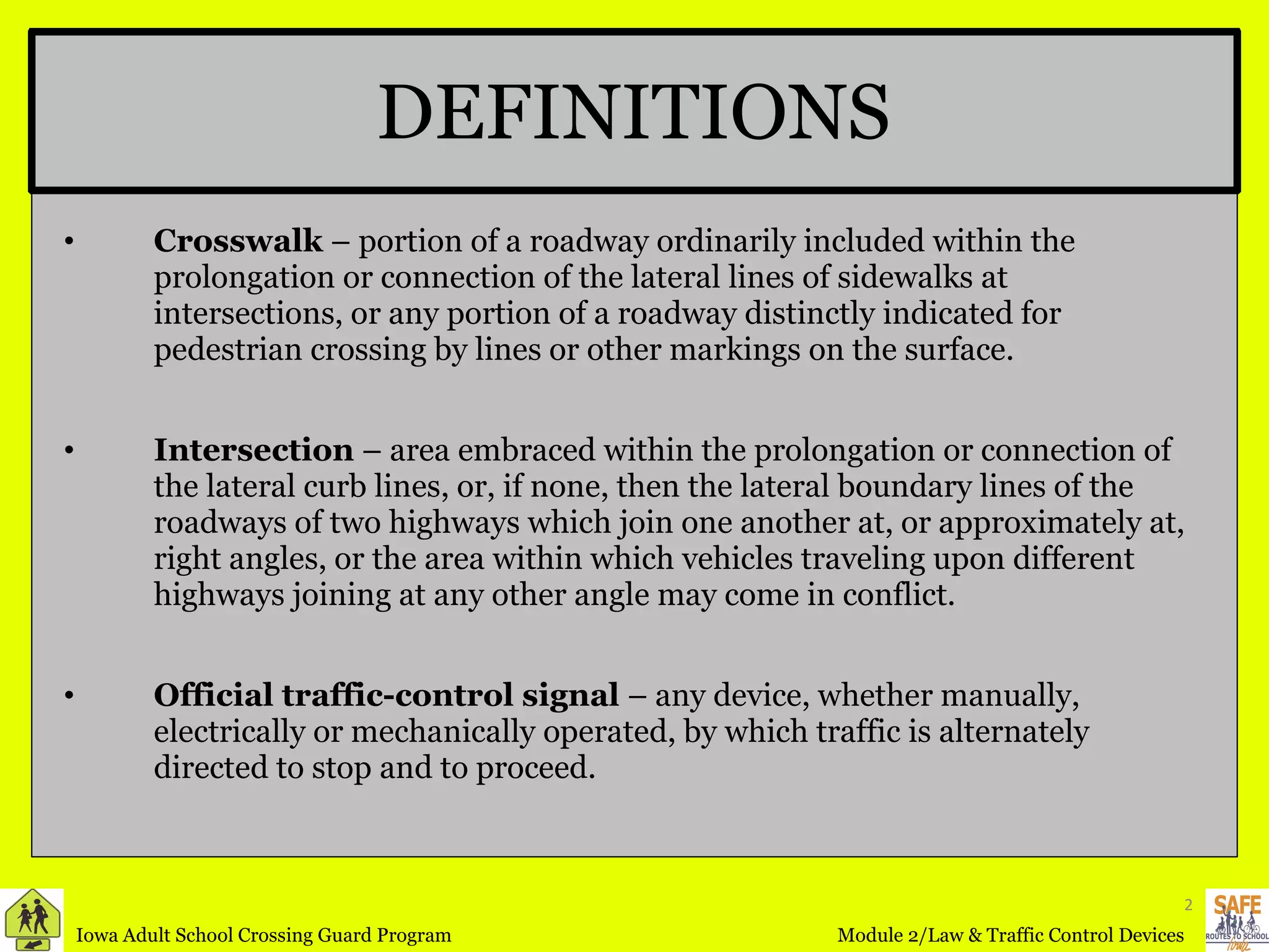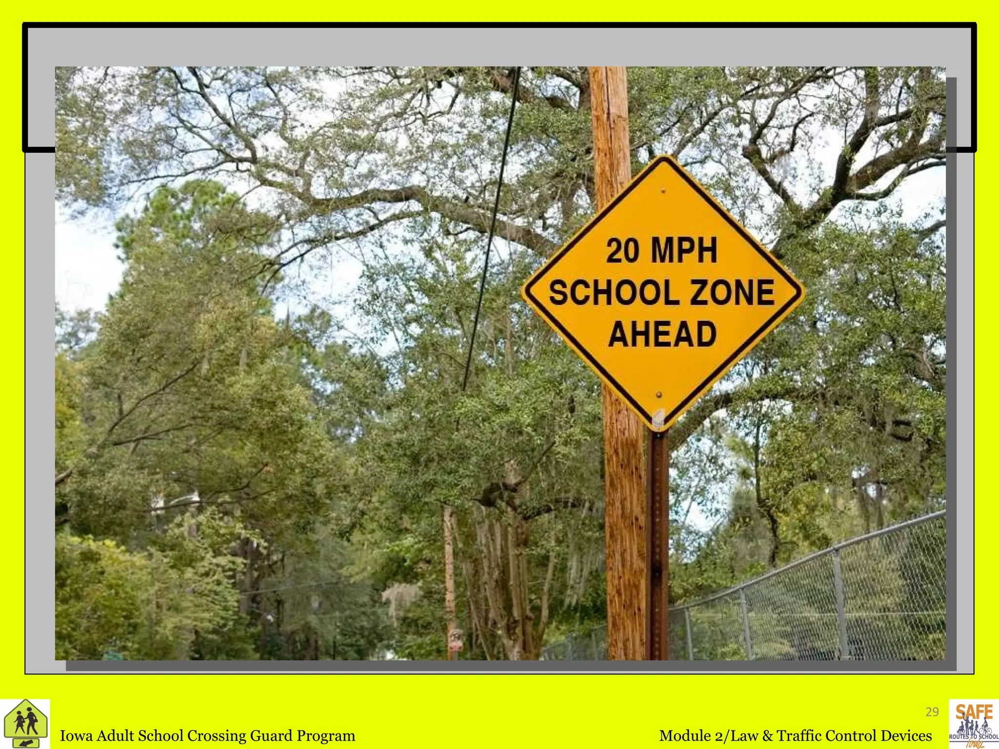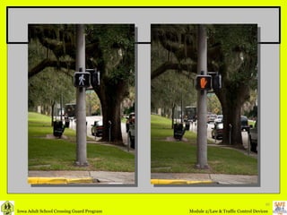 The document provides definitions and information about traffic control devices and laws related to school zones and pedestrian safety. It defines key terms like crosswalk, intersection, traffic control signals, school area and school zone. It outlines vehicle and pedestrian traffic laws and acceptable traffic signs, signals, markings and other controls that should be used in school zones to promote safety.