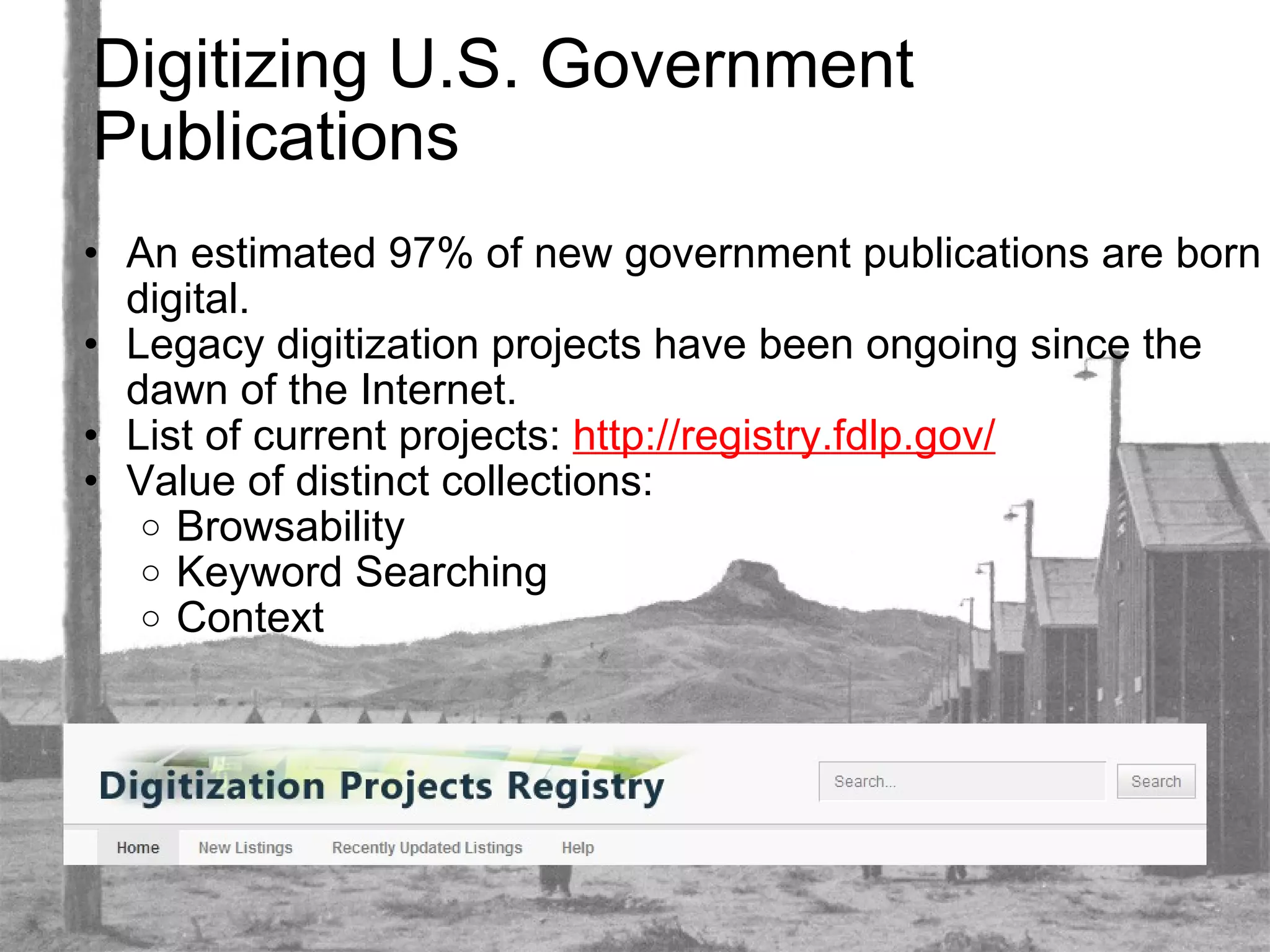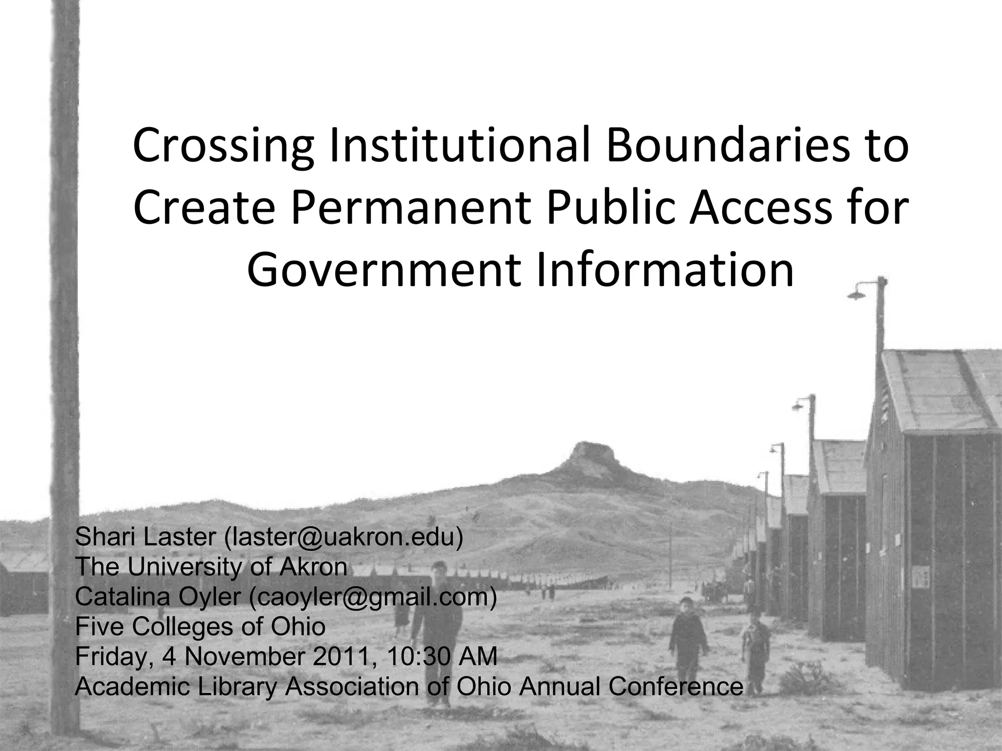 The document discusses the digitization of U.S. government publications, focusing on creating public access through collaboration among various institutions in Ohio. It highlights the challenges and accomplishments of the Ohio Godort in digitizing documents related to the War Relocation Authority, aiming to make them fully accessible while improving metadata processes. Future goals include expanding the collection and seeking partnership opportunities with the Government Publishing Office.