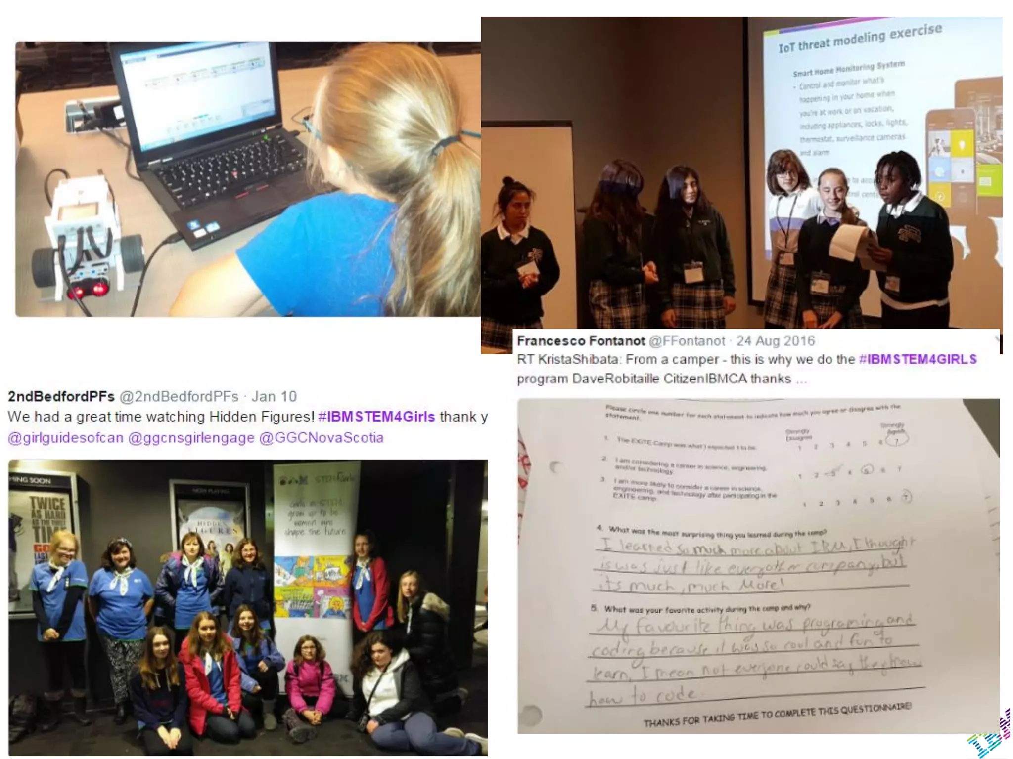The document summarizes IBM's STEM 4 Girls initiative, which aims to empower girls and young women with STEM knowledge. It discusses how gender biases start early and cause girls to disengage from STEM. The initiative targets grades 6-12 and provides programming, camps, and mentorship to excite girls about STEM careers. It also highlights IBM's efforts to recruit and retain women in STEM roles. The summary provides statistics on the initiative's impact, with over 3,000 participants and 400 IBM volunteers since 2016 across 10 cities.