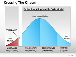 The document describes Geoffrey Moore's technology adoption life cycle model, known as "Crossing the Chasm". It shows five categories of technology users: innovators, early adopters, early majority, late majority, and laggards. It notes a gap, called "the chasm", between early adopters and the early majority that new technologies must cross to reach mainstream markets. Successfully crossing this chasm involves understanding differences in how these user groups view and adopt new technologies.