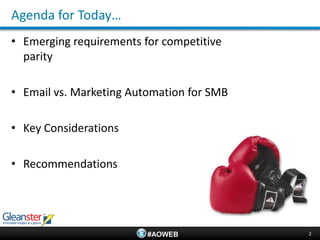 SMBs are considering moving from basic email marketing to more comprehensive marketing automation platforms. Marketing automation can help SMBs generate more leads, increase revenue, and improve marketing efficiency by automating customer engagement across multiple channels. While email is still an important channel, marketing automation provides additional benefits like lead scoring, campaign execution, and social media integration that help address the needs of today's digital customers. Adoption of marketing automation is driven by the ability to quickly respond to changes, generate more leads and revenue, and increase marketing efficiency.