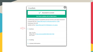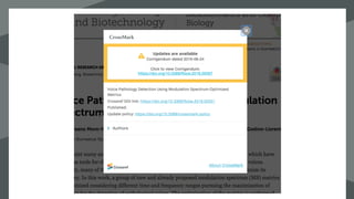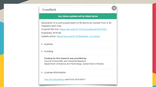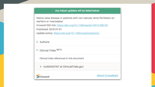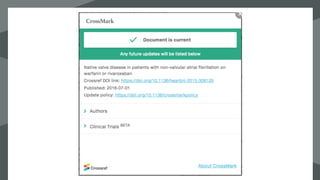 Crossmark is a system providing metadata on the publication status of scholarly works, including updates, corrections, and licensing information. Best practices for using Crossmark include creating a policy page, properly depositing metadata, and adding a Crossmark button to content. As of now, there have been 4.5 million Crossmark deposits and 380 publishers participating in the service.