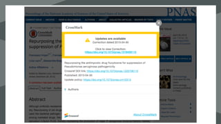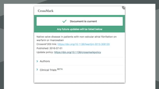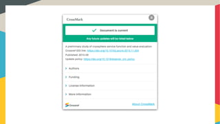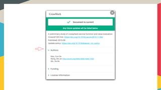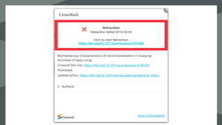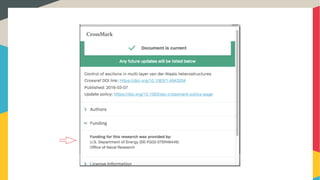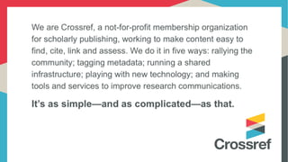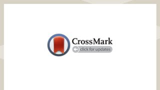 Crossmark is a metadata system that informs about the publication status of research documents, including types of updates like corrections, retractions, and new editions. Publishers are encouraged to adopt best practices for Crossmark implementation, including creating a policy page and depositing relevant metadata. As of the latest data, Crossmark has achieved significant use with over 3.4 million deposits and numerous status updates from more than 300 publishers.
