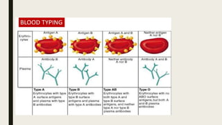 The document discusses blood transfusion, including its history, processes, components, indications, and complications. It describes how blood is collected, tested, separated into components like red blood cells, plasma, and platelets. It provides details on appropriate storage, administration, and indications for transfusion of each component. Complications of transfusion and the importance of blood typing and cross-matching to prevent transfusion reactions are also summarized.