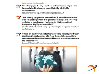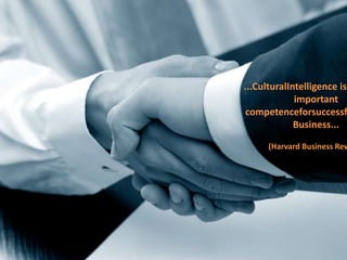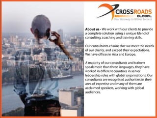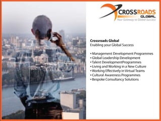 Cultural intelligence is an important competence for success in global business. Crossroads Global provides training and development programs to help companies and individuals improve their cultural intelligence through management development programs, cultural integration training, and global leadership and talent development courses. Their programs help participants start building their cultural intelligence skills today.