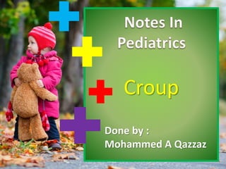 Croup is a common respiratory illness in children, accounting for a significant portion of emergency department visits. The illness is primarily viral, with a range of symptoms including a barking cough, respiratory distress, and low-grade fever, and is mostly benign with low mortality rates. Management typically involves corticosteroids to reduce symptoms, with additional therapies like epinephrine used for severe cases.