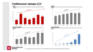 Документ исследует взаимосвязь между биржевым рынком и краудфандингом, подчеркивая, что оба являются дополняющими друг друга сегментами в привлечении капитала. Приведены данные о росте краудфандинга и финансовых инструментов в разных регионах, а также представлены риски и ограничения для инвесторов и компаний. Рассматривается интерес бизнеса, наличие средств у населения для инвестирования и готовность частных инвесторов к рискам.