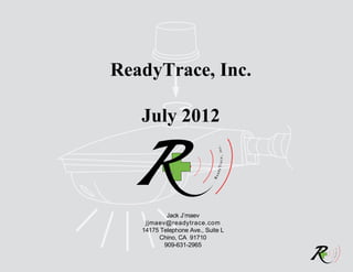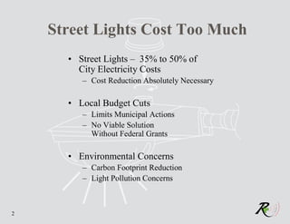 The document describes ReadyTrace's VariLux Street Light Dimmer solution for reducing cities' electricity costs from street lighting. It dimms street lights based on pre-programmed profiles to save up to 50% on costs while addressing concerns about carbon footprint and light pollution. The solution involves replacing photocells with dimmers that install in 5 minutes and are controlled via sub-audible signals broadcast over existing AM radio stations. It provides energy savings, payback periods of 1-3 years, and lifetime cost savings through flexible dimming and tracking of bulb depletion.