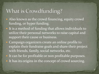 Crowdfunding is a method of funding that utilizes personal networks for capital raising, applicable for both profitable and non-profitable purposes. It has a rich history dating back to the 1700s and has seen significant growth, with platforms supporting various types of campaigns and a predicted industry value of $2.8 billion in 2012. Key factors for success include social media engagement, campaign visibility, and active participation from individuals in the crowd.