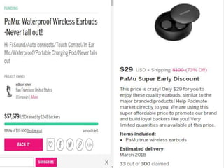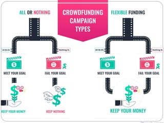 Crowdfunding involves raising money from a large number of people, typically online, to fund a project or venture. It allows entrepreneurs and creative artists to pitch ideas to potential backers. There are different models including donation, reward, lending, and equity. Kickstarter and Indiegogo are large international crowdfunding platforms, while Wishberry focuses on creative projects in India. Wishberry aims to discover and fund creative ideas from India. It operates on a rewards-based model and charges fees for campaign consultation and marketing support.