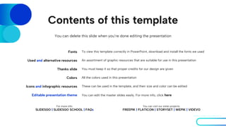 The document is a presentation template for launching a product crowdfunding pitch, providing a structured layout and editable sections for various topics such as market competition, business model, and team introductions. It includes guidelines for using the template, with resources for fonts, icons, and images, along with key information on planets in the solar system as thematic content. The template emphasizes crediting and usage conditions for free and premium users.