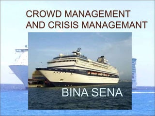 Dokumen tersebut membahas tentang pelatihan manajemen kerumunan dan manajemen krisis di kapal penumpang sesuai dengan ketentuan STCW dan IMO. Pelatihan tersebut meliputi profisiensi dalam manajemen kerumunan dan krisis serta perilaku manusia. Dokumen juga menjelaskan tentang perlengkapan keselamatan kapal dan prosedur darurat.