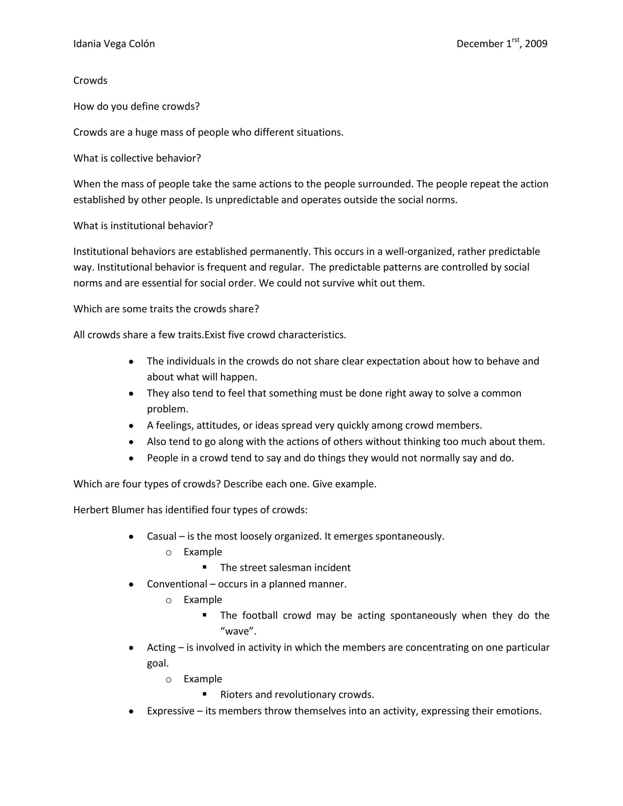 Crowds are large groups of people who take on collective behaviors depending on the situation. Collective behavior occurs when a crowd acts together without established social norms, guided only by the actions of others in the crowd. Institutional behavior follows predictable social norms that control behavior. Crowds share traits of unclear expectations, feeling a problem needs immediate solving, quickly spreading feelings/ideas, going along with others' actions without much thought, and saying/doing things one wouldn't alone. There are four crowd types: casual crowds form spontaneously; conventional crowds form planned but may act spontaneously; acting crowds focus on a single goal; and expressive crowds emotionally engage in an activity.