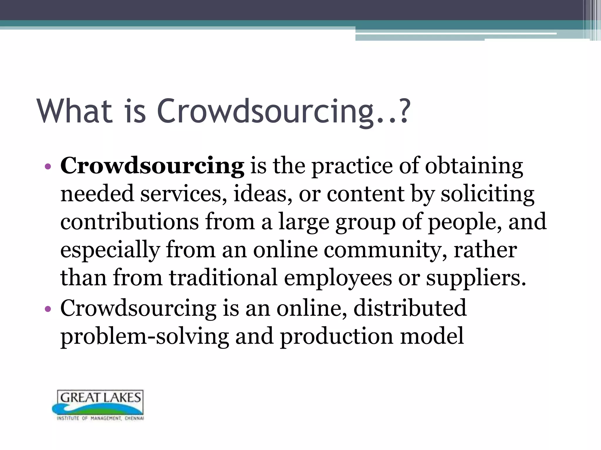 The document discusses crowdsourcing techniques that companies can use. It defines crowdsourcing as obtaining services, ideas, or content from an online community rather than traditional employees. It provides tips for successful crowdsourcing, including defining the crowd, describing the process and deadlines, using a reward system, being transparent, and getting crowd involvement. Some examples of crowdsourcing applications mentioned are customer reviews, product design, discussions to find answers, competitions to solve operational issues, and more.