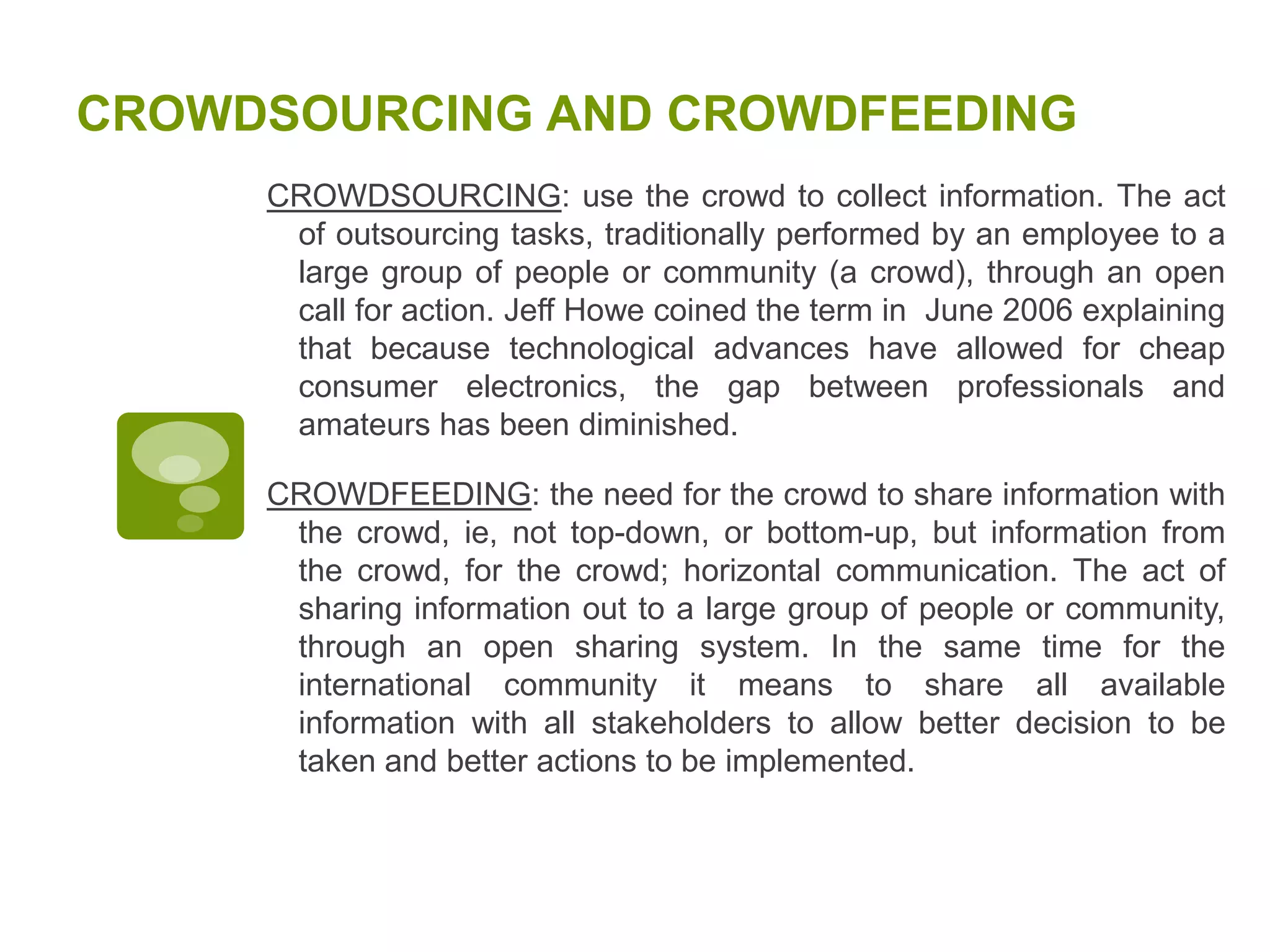 The document discusses the concepts of crowdsourcing and crowdfeeding in participatory information management systems, highlighting their significance during crises and the advantages they provide for real-time information collection. It introduces various methods of crowdsourcing, including unbounded and bounded systems, and tools like Ushahidi and OpenStreetMap that facilitate community engagement in mapping and data sharing. The document also outlines challenges associated with crowdsourcing, including the reliability of information and the need for effective verification and planning in project implementation.