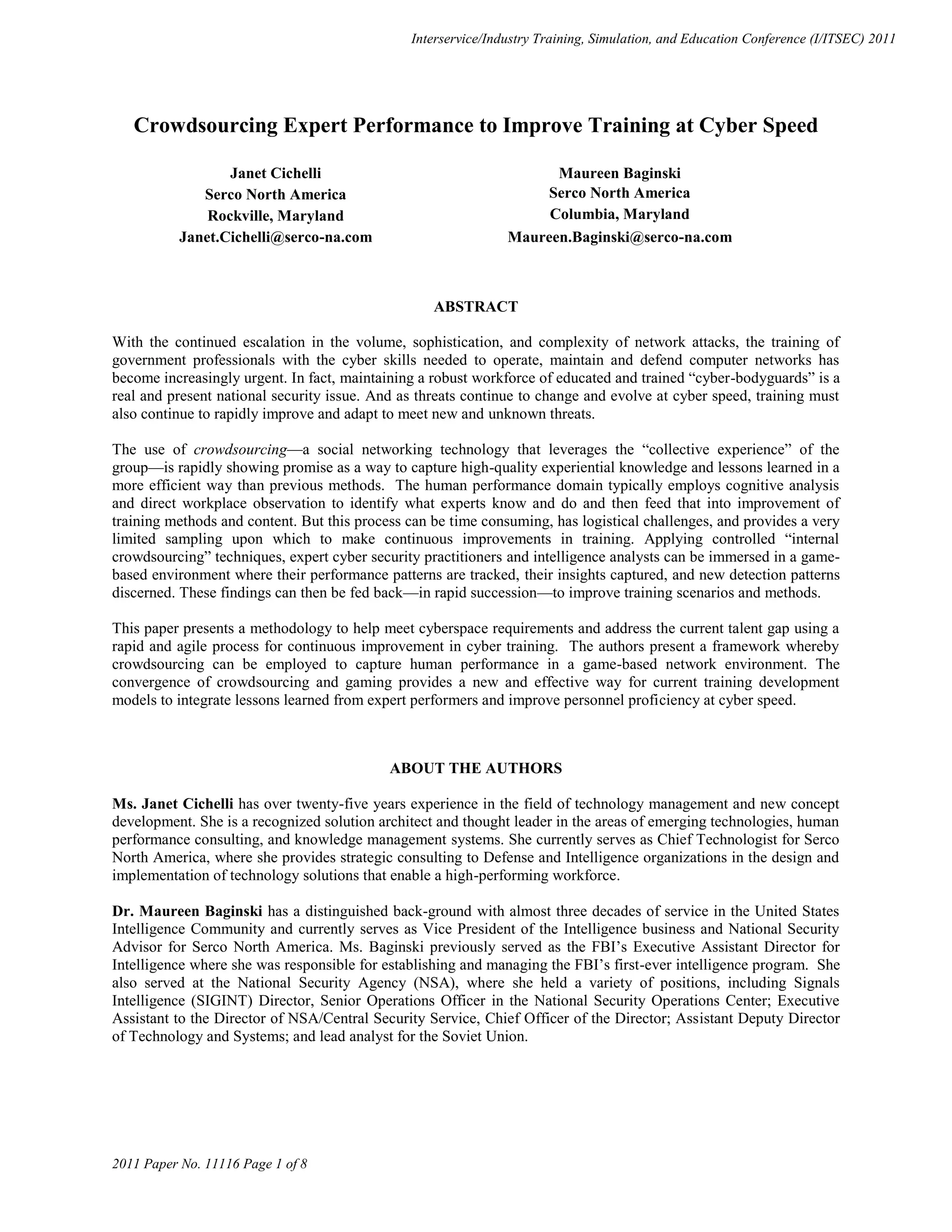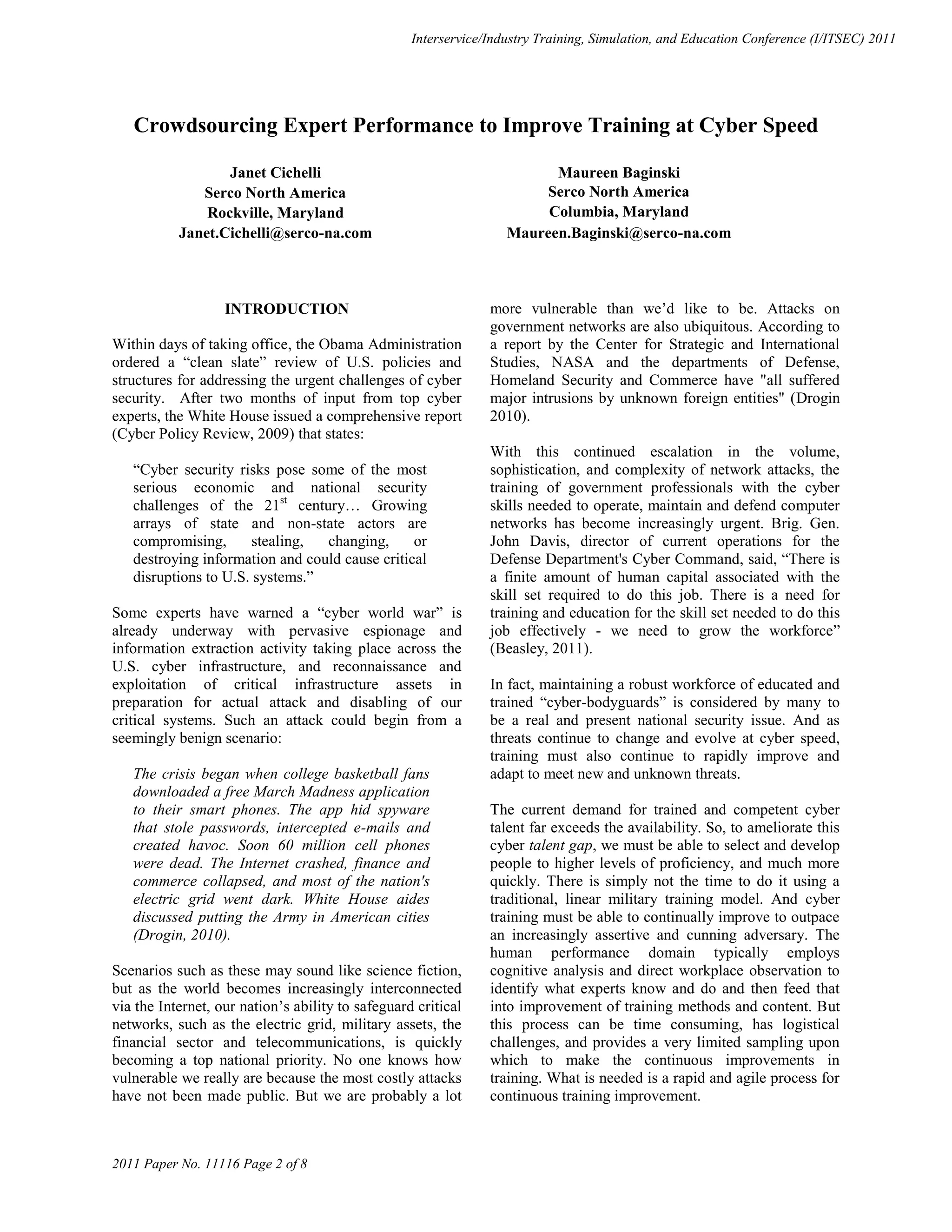 This document discusses using crowdsourcing to improve cybersecurity training by capturing expert performance data. It proposes immersing experts in a game-based virtual environment to track their performance patterns and insights. These findings could then rapidly improve training scenarios and methods to address the shortage of cybersecurity professionals and evolving threats. The authors believe crowdsourcing expert knowledge combined with gaming can help training models integrate lessons learned at "cyber speed" to increase personnel proficiency.