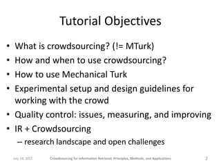 The document provides a comprehensive overview of crowdsourcing for information retrieval, detailing its principles, methods, and applications. It emphasizes the use of platforms like Amazon Mechanical Turk for performing micro-tasks, while discussing the importance of quality control and experimental design. Real-world examples illustrate the effectiveness of crowdsourcing in various fields such as natural language processing and user studies.