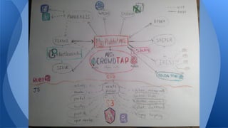 Crowdtap's stack has evolved over 5 years from a single large Rails application to smaller microservices. This allows for more autonomy, easier testing and deployment of separate components. The current stack includes MongoDB, Elasticsearch, Angular, RabbitMQ, Redis, EC2 and S3/Cloudfront. It has moved to a more modular service-oriented architecture (SOA) for improved scalability of development teams and systems.