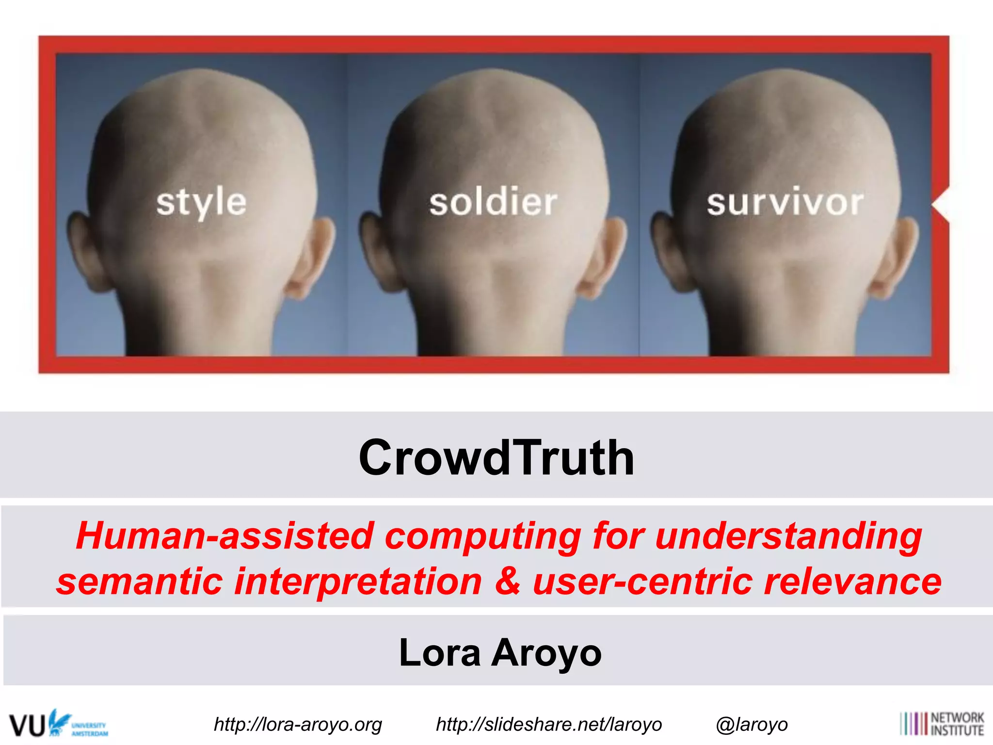 The document discusses the concept of 'CrowdTruth,' a framework aimed at harnessing human disagreement to improve understanding and interpretation of semantic events within online collections. It highlights the varying perceptions of events among individuals and experts, stressing the importance of user-generated content and crowd participation in enhancing relevance and clarity in information extraction tasks. Additionally, it addresses challenges in defining and analyzing events, arguing for the use of disagreement metrics to better capture human interpretation and improve data quality.