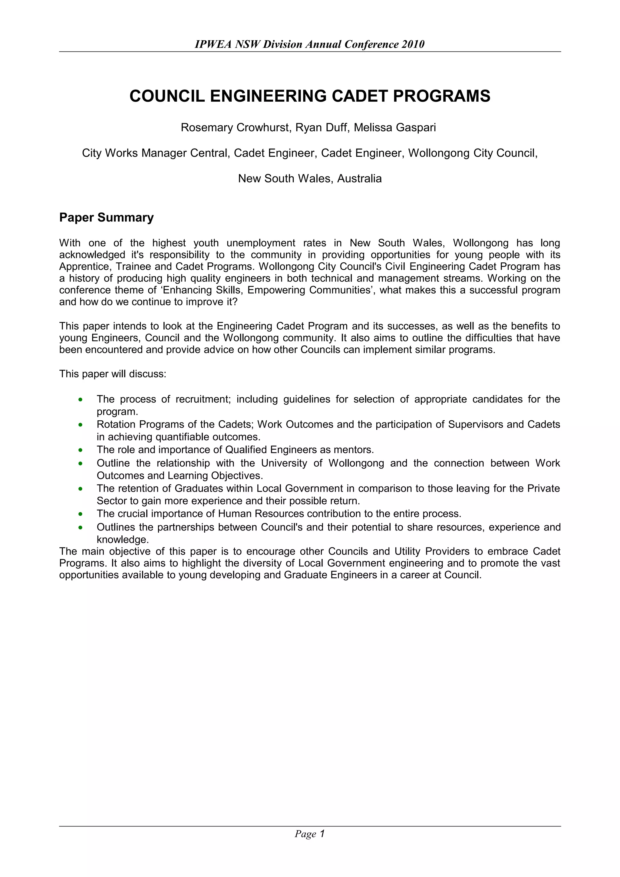 Wollongong City Council's engineering cadet program has a 30-year history of developing skilled engineers and addressing youth unemployment by providing local opportunities. The paper discusses the program's recruitment process, rotation of cadets through various departments, mentoring by qualified engineers, and partnerships with other councils, emphasizing the benefits for both the community and the cadets. It aims to encourage other councils to adopt similar programs to enhance local government engineering careers and improve community engagement.