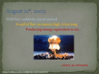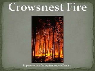The Crowsnest Fire burned over 20,000 hectares of forest in August 2003, forcing evacuations and damaging local businesses like forestry and tourism. While the fire was destructive, it created environmental renewal by opening up space for undergrowth diversity, food for wildlife, and ecological diversity. In 2009, signs of regrowth were evident as the area recovered from the large wildfire six years prior.