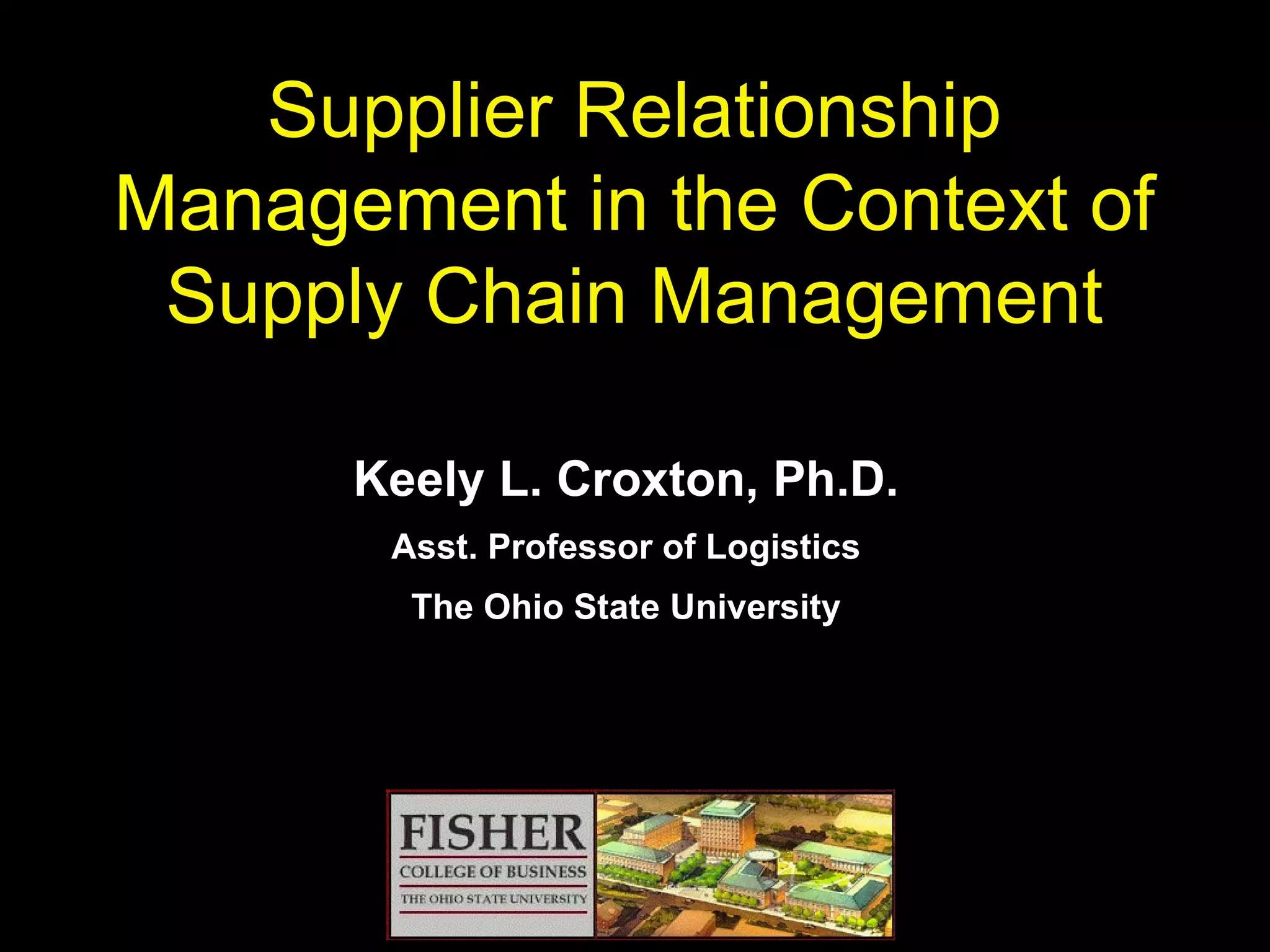 The document discusses supplier relationship management as a key process in supply chain management. It defines supply chain management as integrating business processes from suppliers to end customers to add value. It describes supplier relationship management as providing the structure for developing and maintaining relationships with suppliers, including performance agreements to balance the needs of both parties. The goal is to improve customer service, costs, and profits through collaborative relationships rather than transactional interactions.
