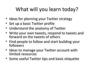 This document provides an introduction to using Twitter for beginners. It outlines how to set up a Twitter profile, engage with others on Twitter through tweets, retweets and replies, find people to follow to build a follower base, use hashtags to categorize tweets, and tips for effective use of Twitter including content planning and time management. The goal is to help new Twitter users understand the basics of using the platform to promote a cause or organization.