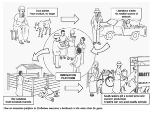 The document discusses the fundamental aspects of innovation platforms in agricultural research, including their design, benefits, constraints, and the roles of stakeholders. It highlights the importance of facilitating dialogue, addressing power dynamics, and ensuring member buy-in for effective implementation. Critical themes such as composition, facilitation, monitoring, and adaptability in response to changing conditions are explored to enhance the functioning of these platforms.