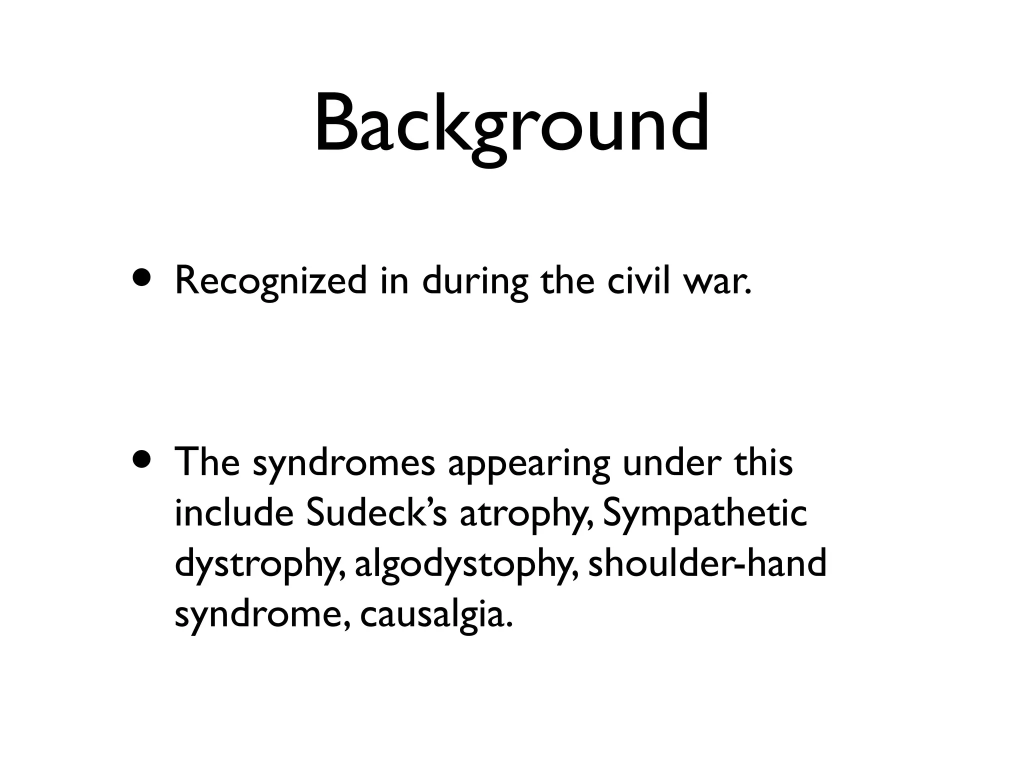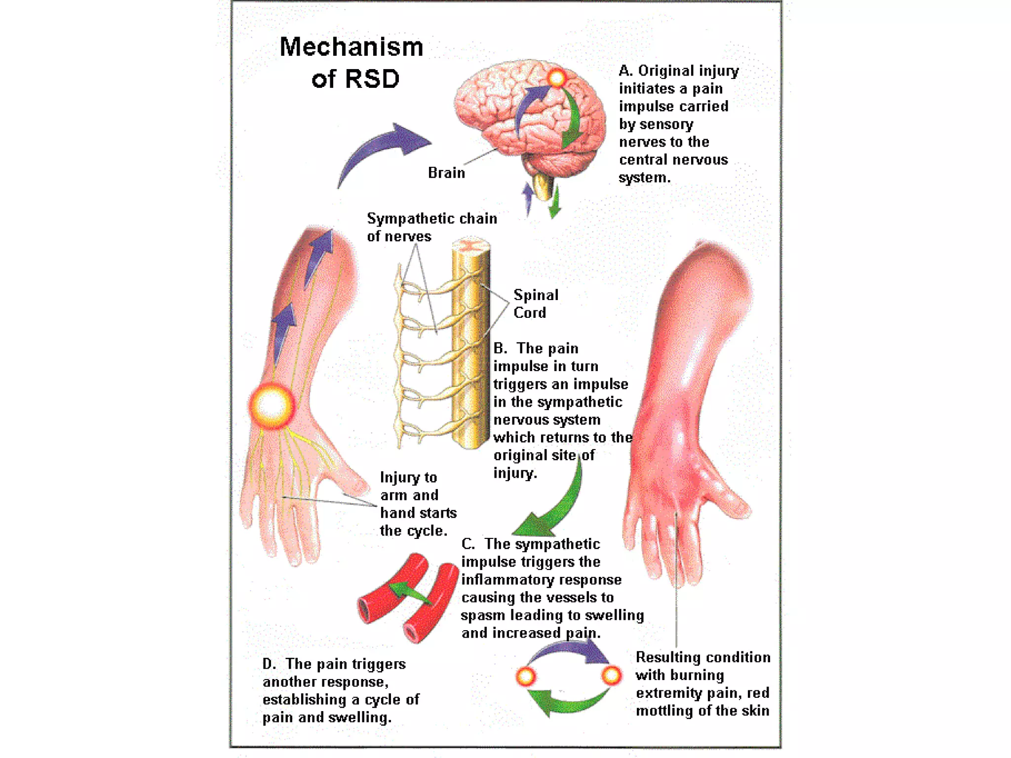 This document provides an overview of Complex Regional Pain Syndrome (CRPS). It defines CRPS as a multi-symptom syndrome affecting one or more extremities that is usually out of proportion to the inciting cause. CRPS involves pain, changes in skin temperature or color, swelling, or restricted joint movement. It discusses the stages of CRPS from initial pain and swelling to potential long-term tissue damage. The document also outlines medical and surgical treatment options.