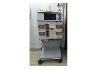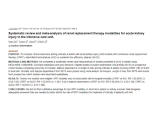 The document discusses continuous renal replacement therapy (CRRT), including its indications, prescription, adverse effects, and comparison to intermittent hemodialysis. CRRT is indicated for hemodynamically unstable patients with acute kidney injury and is used to slowly clear waste and correct fluid/electrolyte imbalances. The prescription details parameters like blood and dialysate flow rates, fluid removal/addition amounts, and anticoagulation. Adverse effects include electrolyte disturbances and bleeding risks. CRRT is more portable and suitable for urgent cases than intermittent hemodialysis.