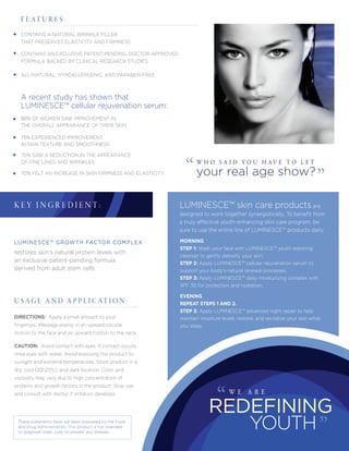The document summarizes a cellular rejuvenation serum that uses an exclusive formula derived from adult stem cells containing over 200 growth factors and cellular messengers. It supports the skin's natural ability to renew, restore, and rejuvenate by reducing the appearance of fine lines and wrinkles. Clinical studies showed that the serum helped improve the appearance of the skin and reduced signs of aging for many users. The serum aims to replenish depleted growth factors and proteins in the skin that can lead to signs of aging.