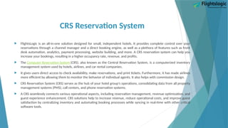 The document describes a CRS (Central Reservation System) as a comprehensive solution for small hotels to manage bookings efficiently across various channels, enhancing occupancy rates and profits. It outlines the features, benefits, and operational integration of CRS software, emphasizing its role in improving customer experience, revenue management, and operational efficiency. Flightslogic offers a cloud-based CRS that connects hotels to multiple distribution channels, providing real-time updates and data analytics to streamline operations.