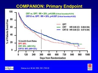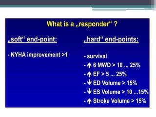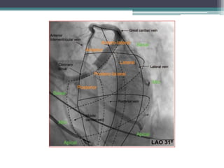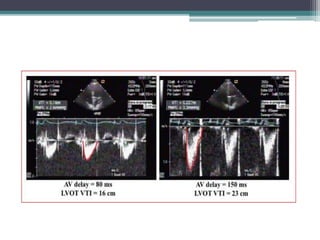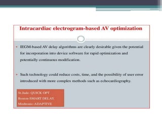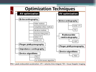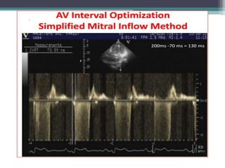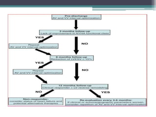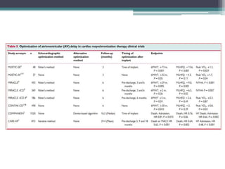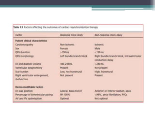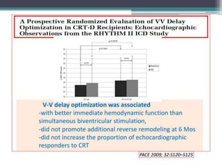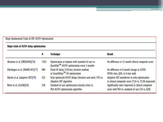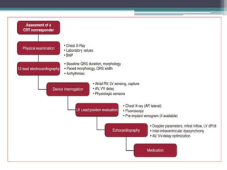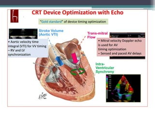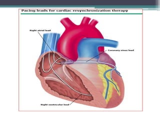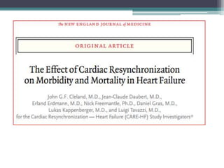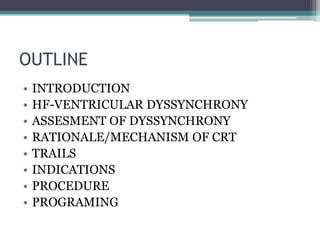 This document provides an overview of cardiac resynchronization therapy (CRT), including indications, assessment of dyssynchrony, rationale/mechanism, trials, procedures, and programming. It discusses the types and assessment of cardiac dyssynchrony using ECG, echocardiography, MRI, and nuclear imaging. Key trials on CRT are summarized, showing benefits for heart failure patients with reduced ejection fraction and wide QRS duration or echocardiographic evidence of dyssynchrony even in narrow QRS.