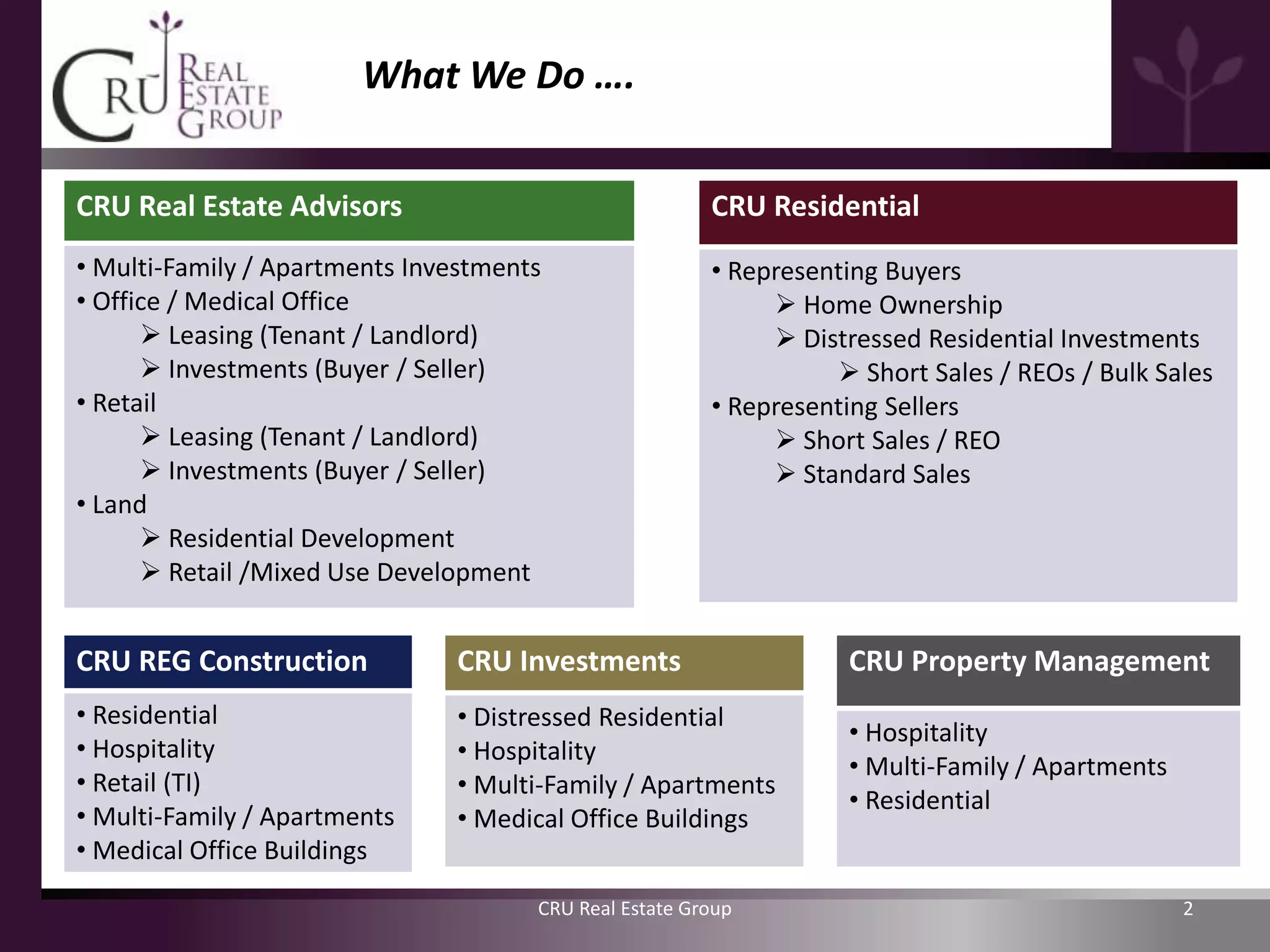 CRU Real Estate Group is a commercial real estate firm that provides services in multiple areas including investment, leasing, development, construction, and property management for multi-family/apartments, office/medical office, retail, land, hospitality, and residential properties. The firm has multiple regional office locations across the western United States and is looking to expand its network of agents nationwide.