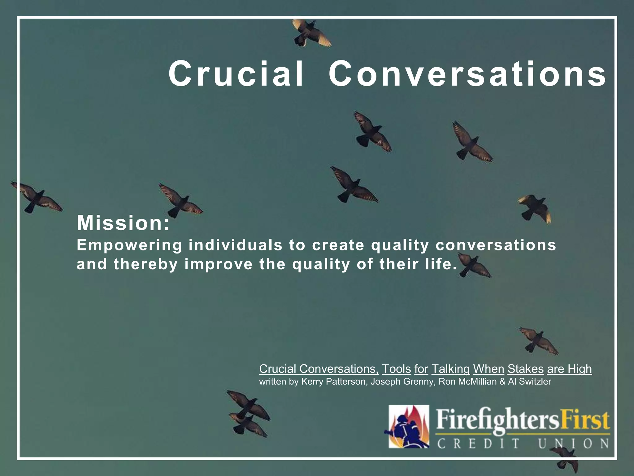 This document summarizes the key points from the book "Crucial Conversations" by Kerry Patterson, Joseph Grenny, Ron McMillian & Al Switzler. The book teaches skills for having crucial conversations, which are high-stakes dialogues about important topics that require discussing sensitive issues. It discusses how to avoid common unproductive responses like fighting, flighting, or accepting the "sucker's choice" of truth versus relationship. The book provides tools for making conversations safe, keeping unhealthy goals in check, and strengthening relationships even during difficult discussions.