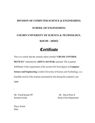 This document summarizes a seminar report on cruise control devices presented by Aditya Kumar for a Bachelor of Technology degree. It discusses the principles and components of adaptive cruise control systems, which use sensors like LIDAR and radar to detect the distance and speed of preceding vehicles and control throttle and braking accordingly. Stop-and-go cruise control is described for congested traffic, while cooperative adaptive cruise control involves vehicles communicating with each other. The report provides details on LIDAR and pulse-Doppler radar operation and antenna schemes used in sensors. It concludes by addressing advantages and challenges of adaptive cruise control technologies.
