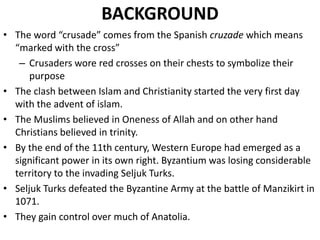The Crusades were a series of religious wars initiated in 1096 by European Christians in response to Muslim control of the Holy Land. The First Crusade succeeded in capturing Jerusalem in 1099, establishing the Kingdom of Jerusalem. However, Muslim leaders like Nuruddin and Saladin fought to recapture lands. Saladin defeated the Crusaders at the Battle of Hattin in 1187 and recaptured Jerusalem. This led to the Third Crusade which failed to retake Jerusalem. While the Crusades involved many campaigns over two centuries, they ultimately failed to permanently occupy the Holy Land and Jerusalem returned to Muslim control by 1246.
