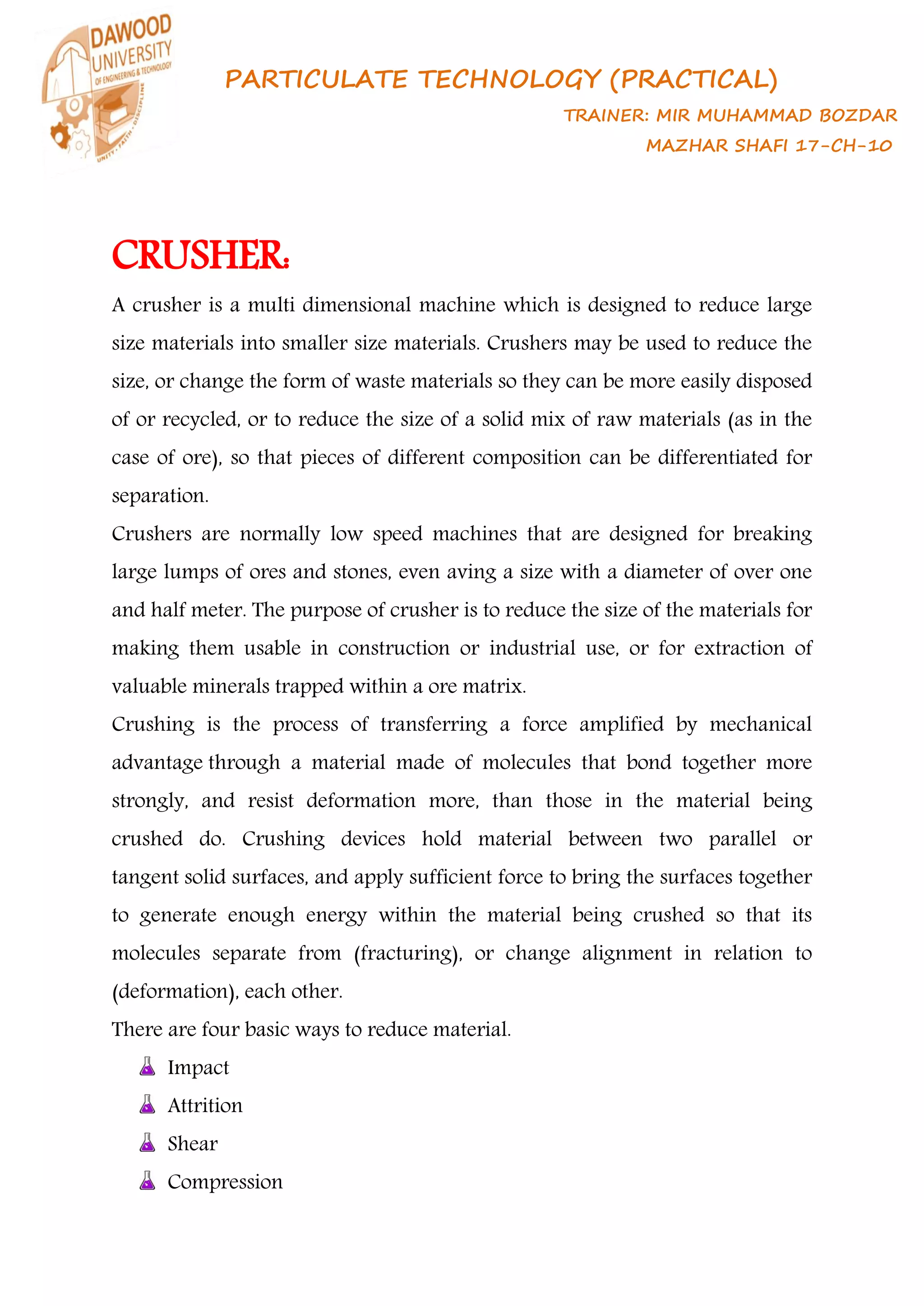 A crusher is a machine that reduces large rocks into smaller pieces by using impact, attrition, shear, or compression. There are four main types of crushers: jaw crushers, gyratory crushers, cone crushers, and roll crushers. Jaw crushers use compression force to break rocks between a fixed and moving surface, while gyratory and cone crushers use a similar principle with a gyrating motion to break rocks inside an enclosed chamber. Roll crushers use cylindrical rollers to crush material. Each crusher type has different features that make it suitable for different applications depending on the material properties.