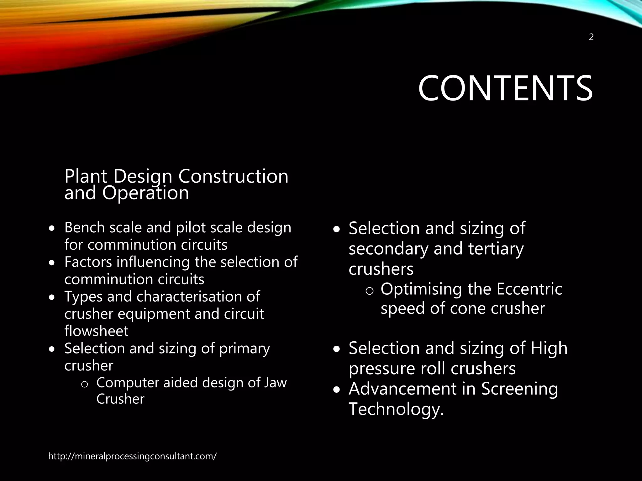 The document discusses factors that influence the selection of comminution circuits for mineral processing plants. It outlines various types of tests and data that can be collected from bench scale testing, pilot plants, and ore characterization studies. This includes grindability tests, crushability tests, and physical properties analysis. The results of these tests provide information to determine the appropriate comminution circuit design based on factors like ore hardness, throughput requirements, power considerations, and economic optimization. Well-designed testing and data collection allows selection of the most efficient and cost-effective comminution circuit configuration.