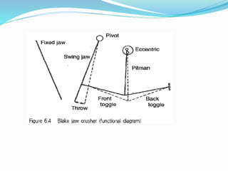 Crushing is the first mechanical stage in the comminution process for extracting and refining ore. It typically occurs in two or three stages, with primary crushing reducing ore sizes from 1.5m to 10-20cm using heavy-duty machines. Crushing can be done via open or closed circuits. Primary crushers, like jaw and gyratory crushers, are heavy-duty machines that reduce run of mine ore sizes for transport and feeding to secondary crushers. Jaw crushers consist of two plates that open and close to crush material, and come in blake, dodge, and universal styles that vary feed and discharge areas.