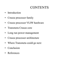 The document provides information on the Crusoe processor developed by Transmeta Corp. It summarizes that the Crusoe processor is a 128-bit microprocessor designed for mobile devices where low power consumption is required. It operates at 500-700 MHz and uses Transmeta's code morphing software and long run power management technologies. The document outlines the Crusoe processor family, its VLIW hardware architecture, long run power management features, and architecture. It also discusses where Transmeta could expand its applications in the future.