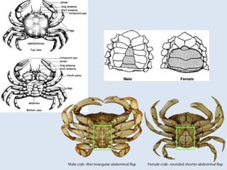 Crustaceans are arthropods in the subphylum Crustacea and include crabs, shrimp, lobsters, barnacles, copepods, krill, isopods, and amphipods. They have a jointed exoskeleton and specialized appendages for locomotion, feeding, breathing through gills, and sensing the environment. Crustaceans can be predators, scavengers, or filter feeders. They have separate sexes and males release sperm packets for females to store until fertilizing their eggs, which hatch externally.