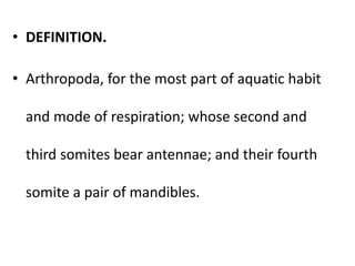 This document summarizes key aspects of crustacean anatomy and evolution. It describes how crustaceans evolved specialized limbs for locomotion, feeding, respiration and sensing. Their bodies shortened as limb functions increased. Many developed a carapace for protection. These factors led to six subclasses. The subclasses differ in features like feeding method, presence of a carapace, and limb specialization. The document also outlines general crustacean anatomy including cuticle, somites, tagmata, nervous system, senses, digestion, respiration, circulation and reproduction.