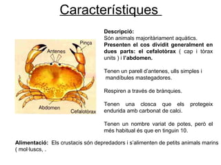 Crustacis 1. 2. Característiques Descripció: Són animals majoritàriament aquàtics. Presenten el cos dividit generalment en dues parts: el cefalotòrax ( cap i tòrax units ) i l’abdomen. Tenen un parell d’antenes, ulls simples i mandíbules mastegadores. Respiren a través de brànquies. Tenen una closca que els protegeix endurida amb carbonat de calci. Tenen un nombre variat de potes, però el més habitual és que en tinguin 10. Alimentació: Els crustacis són depredadors i s’alimenten de petits animals marins ( mol·luscs, . 3. 4. 5. 6. 7.