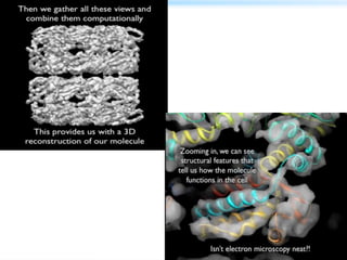 This document discusses cryo-electron microscopy (cryo-EM), a technique used to image biological macromolecules in their native frozen state without staining or chemical fixation. It describes how cryo-EM overcomes limitations of traditional transmission electron microscopy by rapidly freezing samples to vitrify water and prevent ice crystal formation. The document outlines key developments in cryo-EM including contributions from Richard Henderson, Jacques Dubochet, and Joachim Frank who were awarded the 2017 Nobel Prize in Chemistry. Examples of structures solved using cryo-EM such as the Zika virus and nuclear pore complex are provided. Advantages and applications of cryo-EM are summarized.