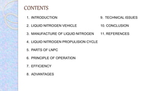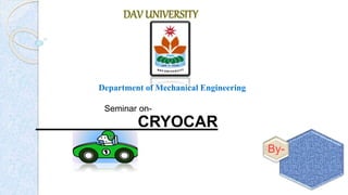 This document summarizes a seminar presentation on cryogenic vehicles (cryocars) that use liquid nitrogen as fuel. It describes how liquid nitrogen is produced, the basic parts and operation of a liquid nitrogen propulsion system, including a cryogen storage vessel, pump, economizer, heat exchanger and expander engine. The document discusses the improved efficiency of newer cryocars compared to early models and notes advantages over electric and fossil-fueled vehicles, while also outlining technical issues that have prevented commercialization, such as safety concerns and the energy required to produce liquid nitrogen.
