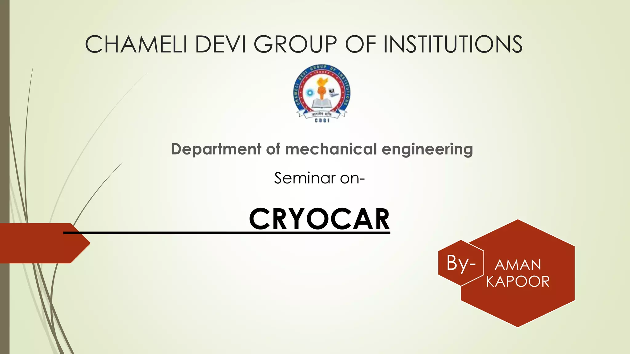 The document summarizes a seminar presentation on liquid nitrogen vehicles (LNVCs). It discusses that LNVC use liquid nitrogen as a fuel, which is pressurized and vaporized to power the vehicle. The document outlines the key parts of an LNVC including the cryogen storage vessel, pump, economizer, heat exchanger, and expander. It also discusses the operation, efficiency, advantages over electric vehicles, and challenges preventing commercialization like safety and funding issues.