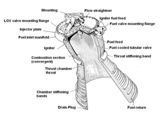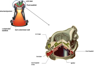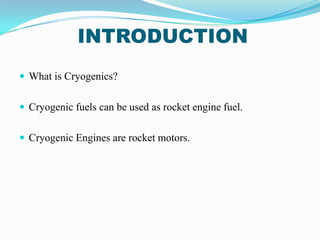 This document discusses cryogenic rocket engines. It begins with an introduction to cryogenics and cryogenic fuels that can be used for rocket engines. It then discusses the history of rocketry development by Russia and the US. Current rockets use liquid-fueled cryogenic engines, with the first being the RL10 in the 1960s. Cryogenic engines use supercooled liquid fuels like liquid oxygen and hydrogen that provide high energy density. Key components include the combustion chamber, injectors, pumps, valves and tanks. Cryogenic fuels allow for compact fuel storage on rockets. While powerful, cryogenic engines also present challenges like leakage and embrittlement issues. In conclusion, cryogenic rocketry is important for space exploration due to
